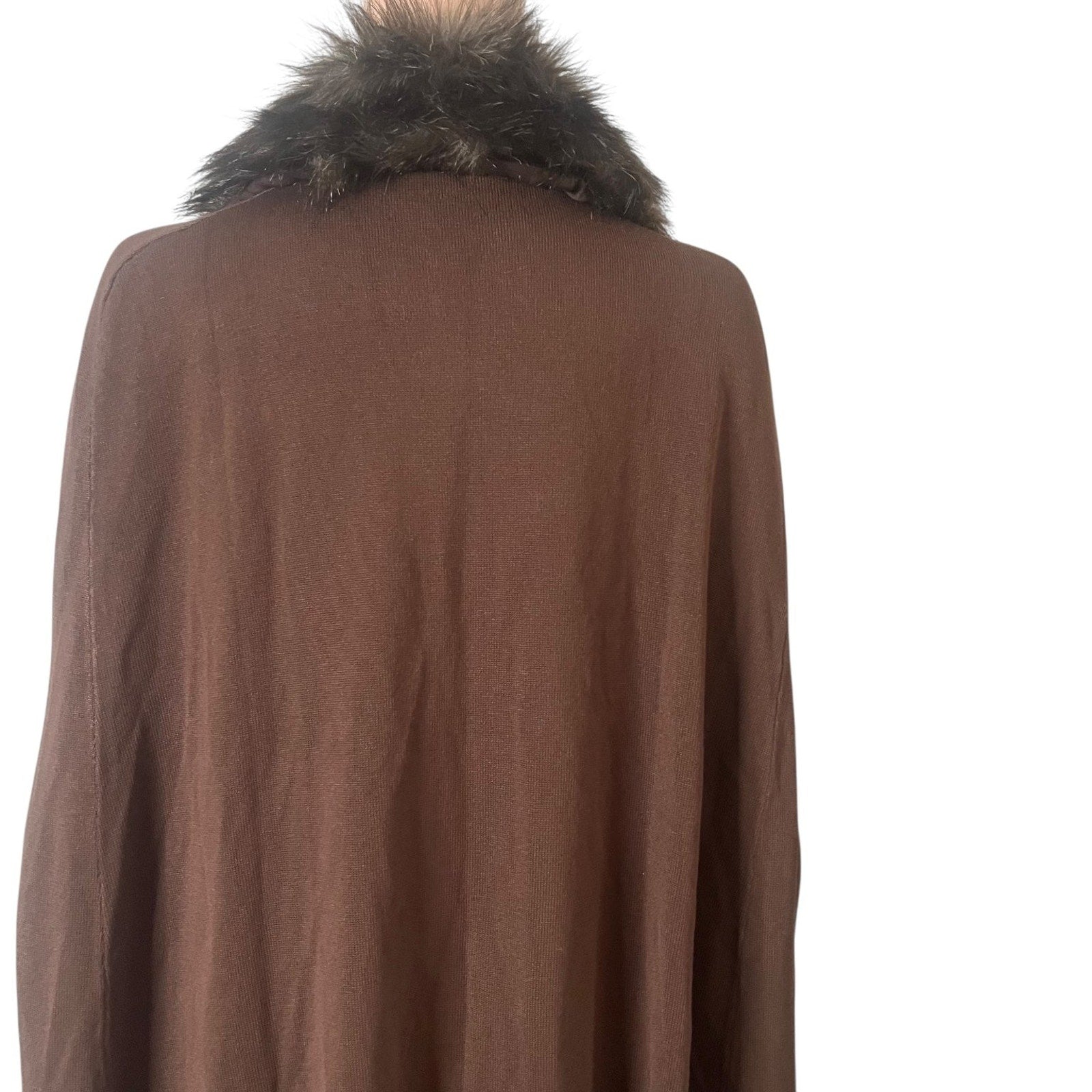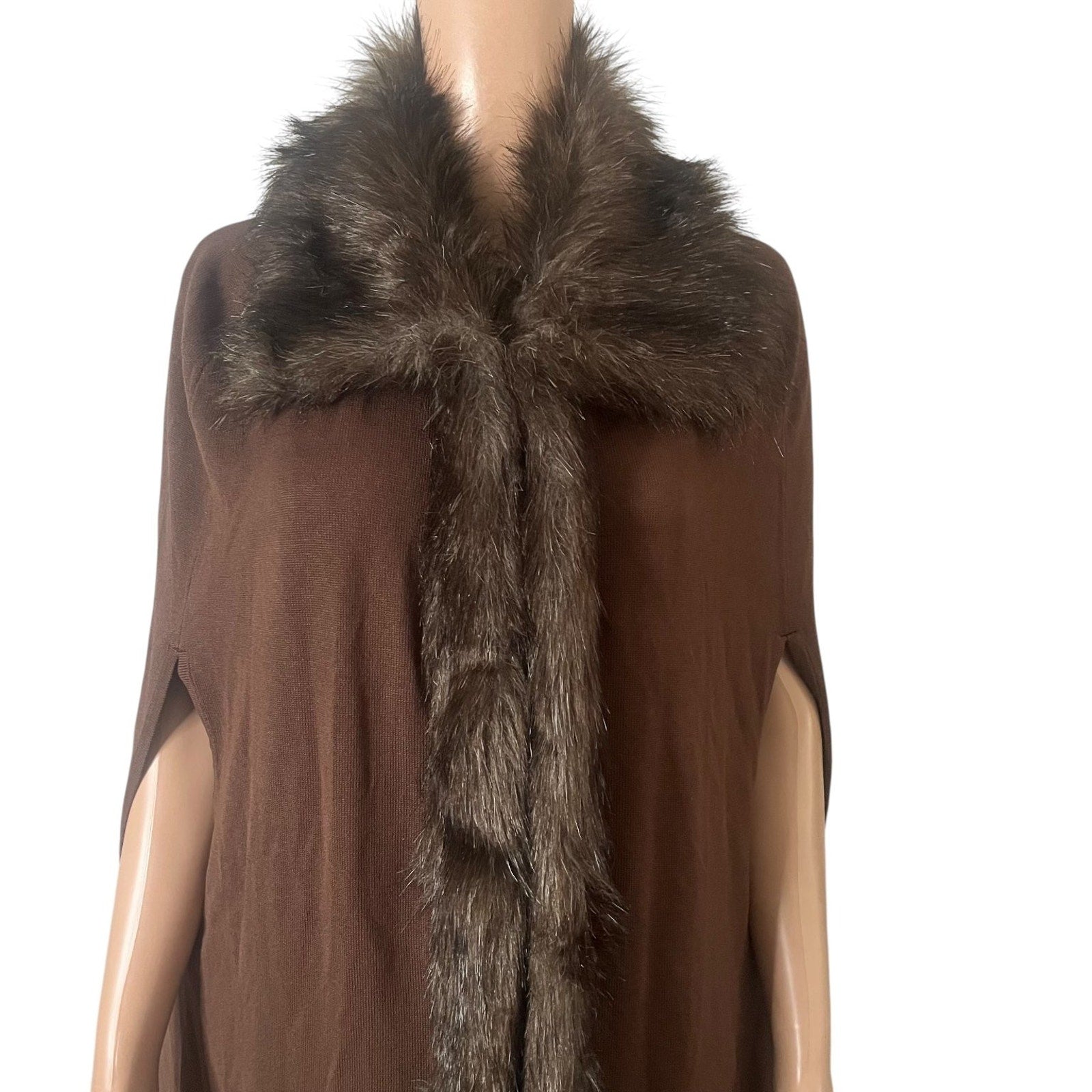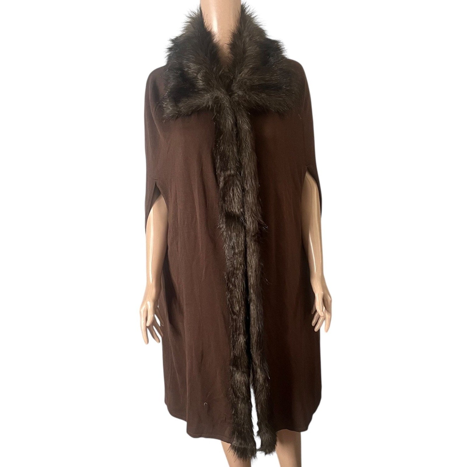 Elevate your wardrobe with this luxurious Antthony Original women's sweater cape, crafted in a rich brown hue that exudes warmth and elegance. Designed in a large size for a comfortable and flattering fit, this piece features an open-front style adorned with a plush fur trim along the collar and front edges, adding a touch of classic sophistication. The sleeveless design offers versatility, perfect for layering over your favorite long sleeve tops or dresses during cooler seasons.