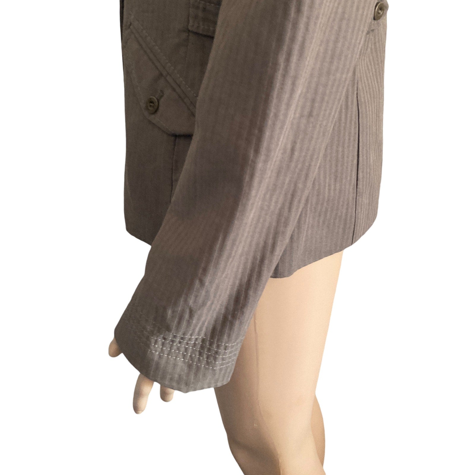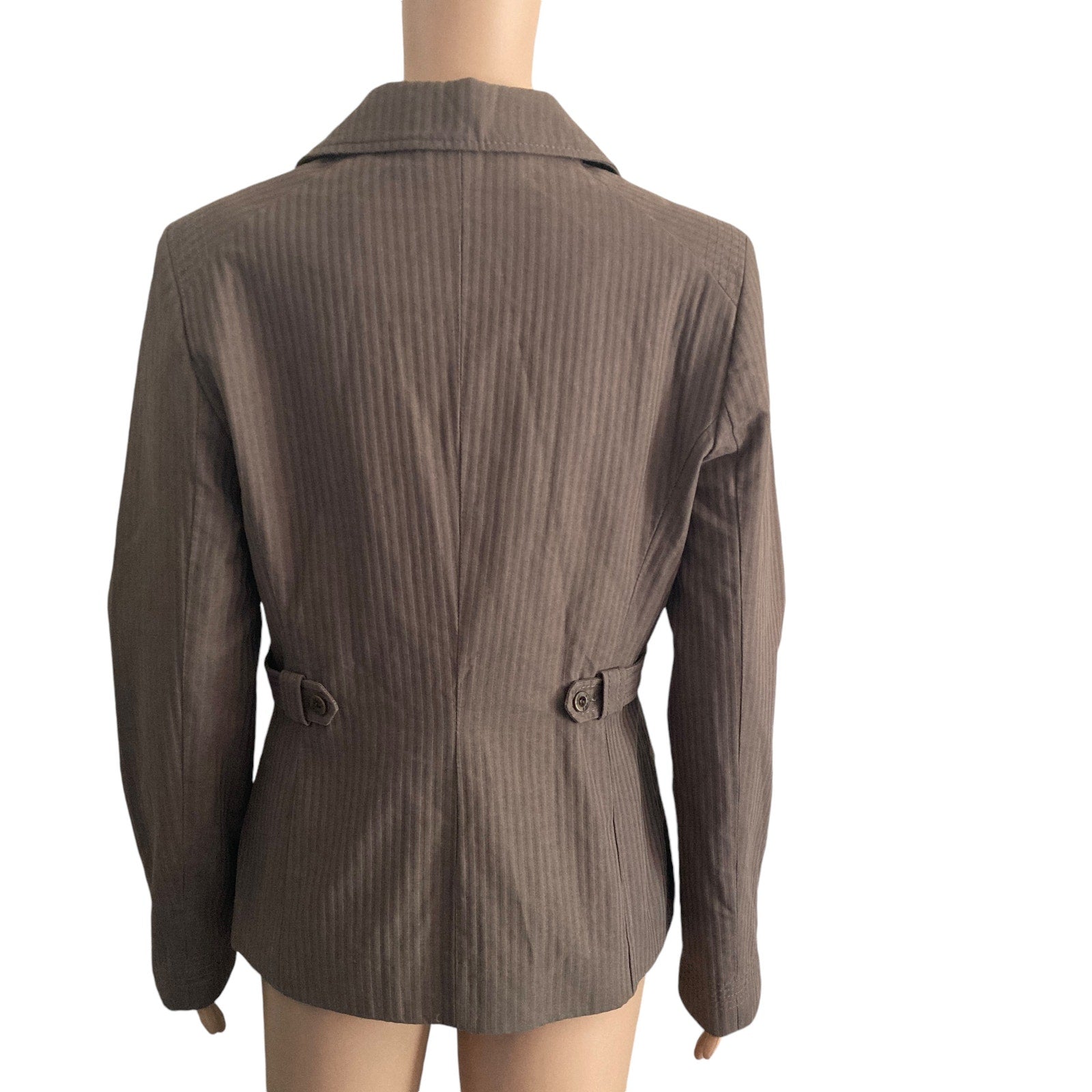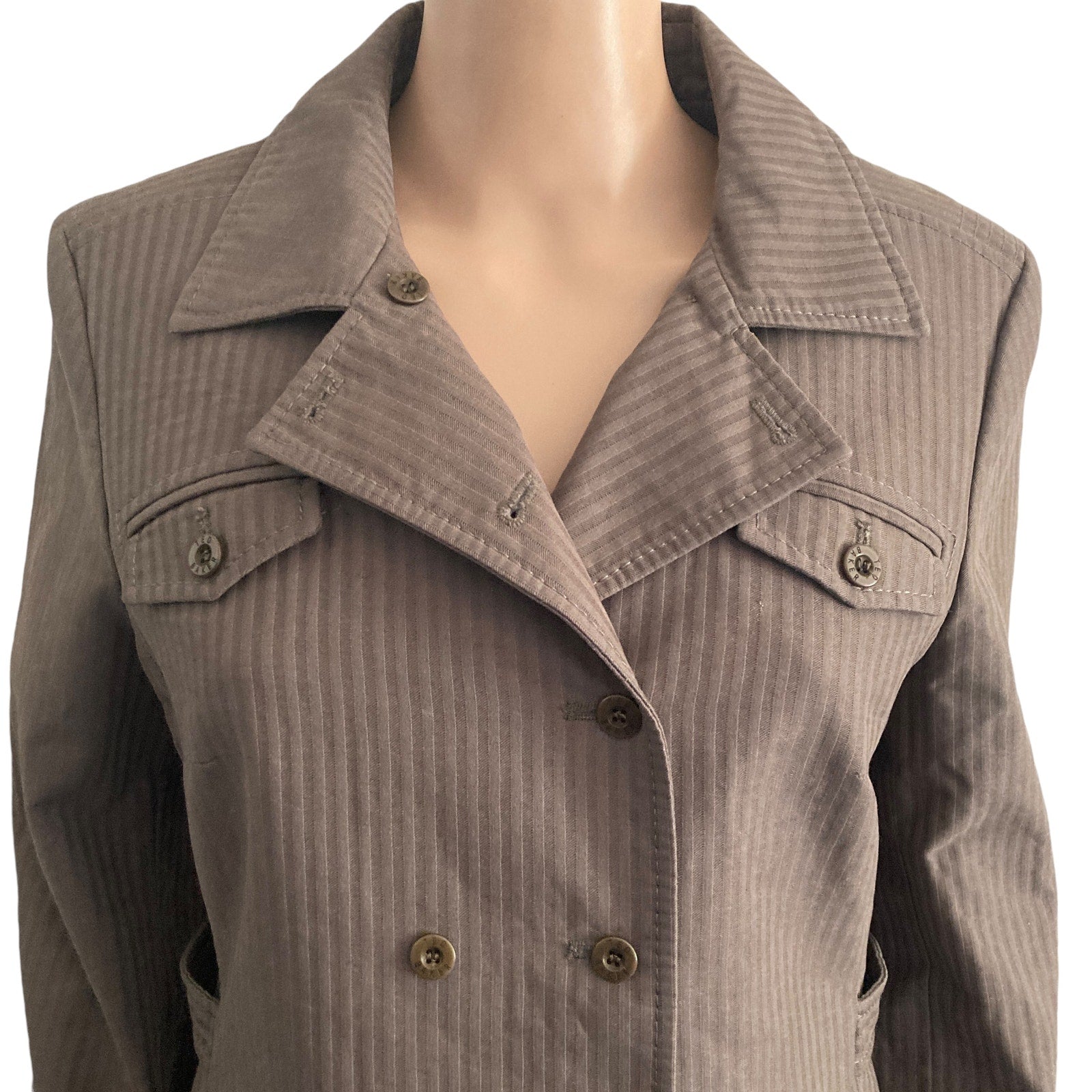 Elevate your wardrobe with this stylish Ted Baker London blazer! This pre-owned, double-breasted blazer is in very good condition and features a classic brown pinstripe design. Perfect for adding a touch of sophistication to any outfit. Please review measurements to ensure fit.