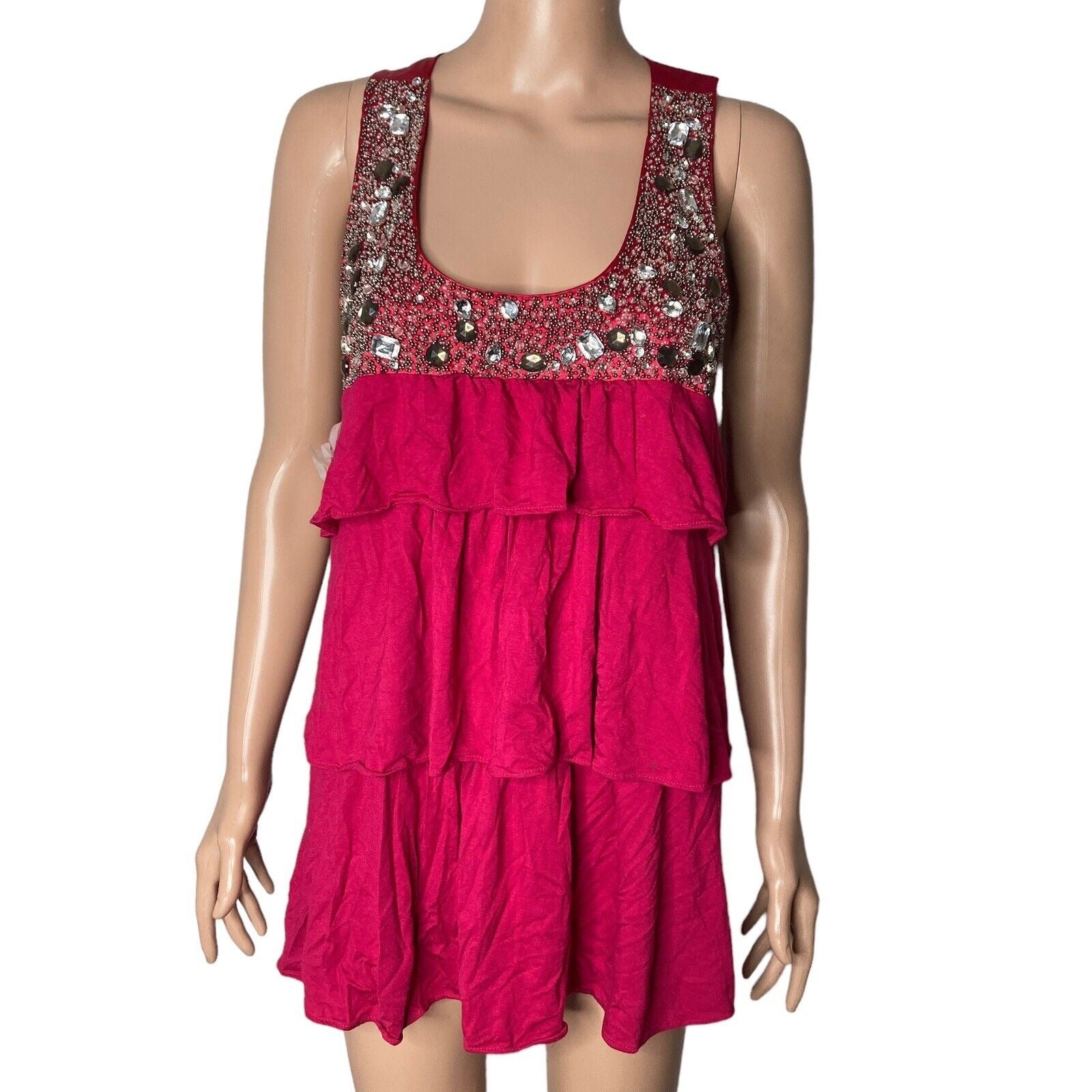 Rain Shirt Womens XL Fuchsia Rhinestone Beaded Tiered Sleeveless